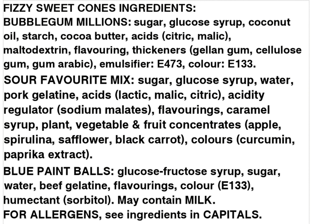 All Sweet Cones come with ingredients and allergens labels attached, see pictures for detailed information.