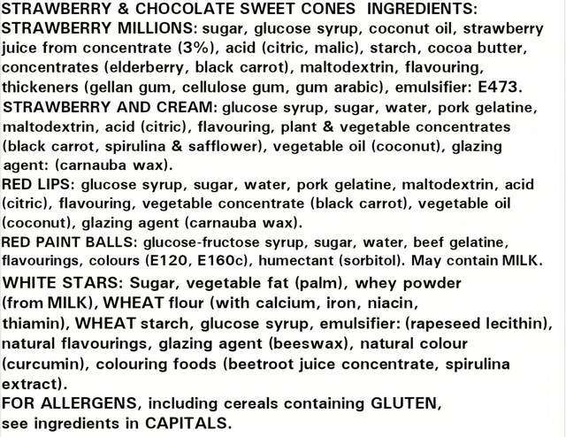 All Sweet Cones come with ingredients and allergens labels attached, see pictures for detailed information.